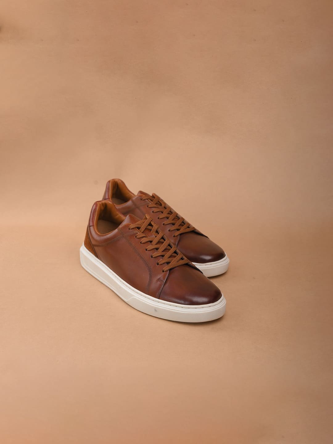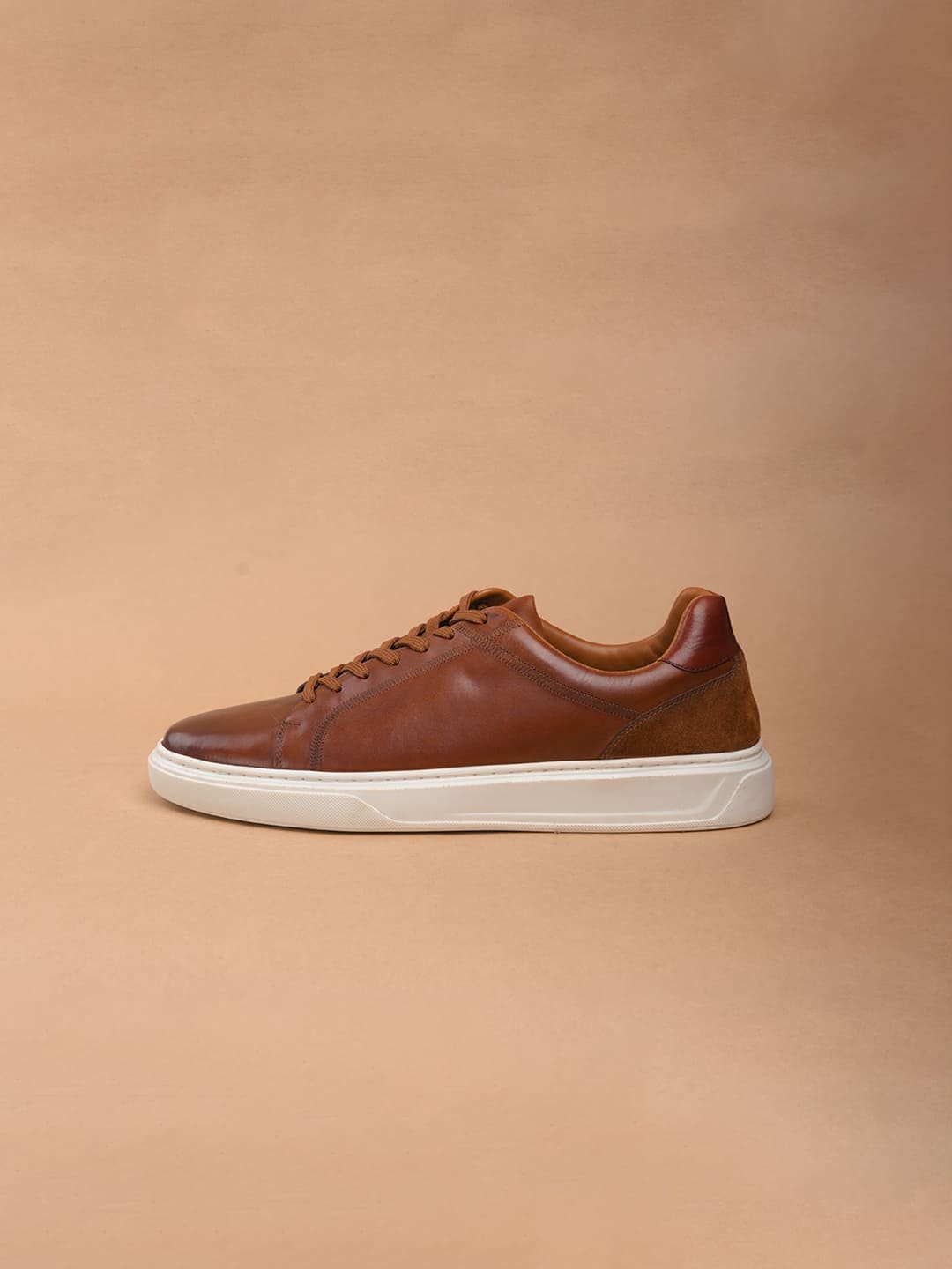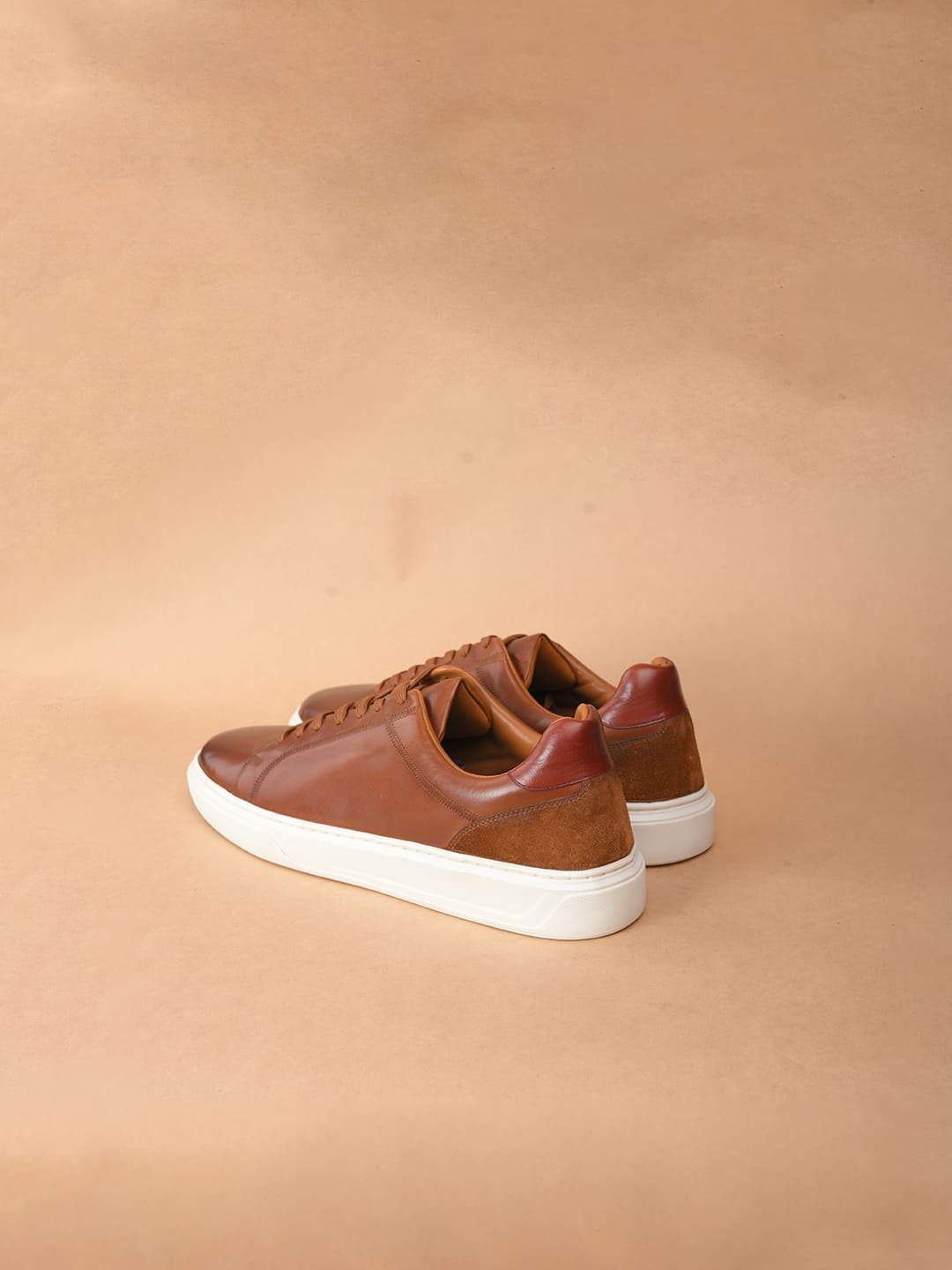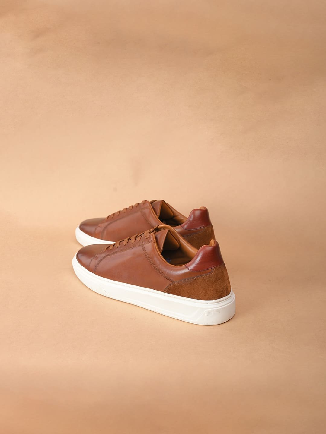 Step into style with Duka, tan leather sneakers from The Brown Hide. Made with top-quality full-grain crust, these sneakers feature a sleek two-tone finish and a chic brown suede detail at the back. The classic white cup sole and matching white laces add a timeless touch.